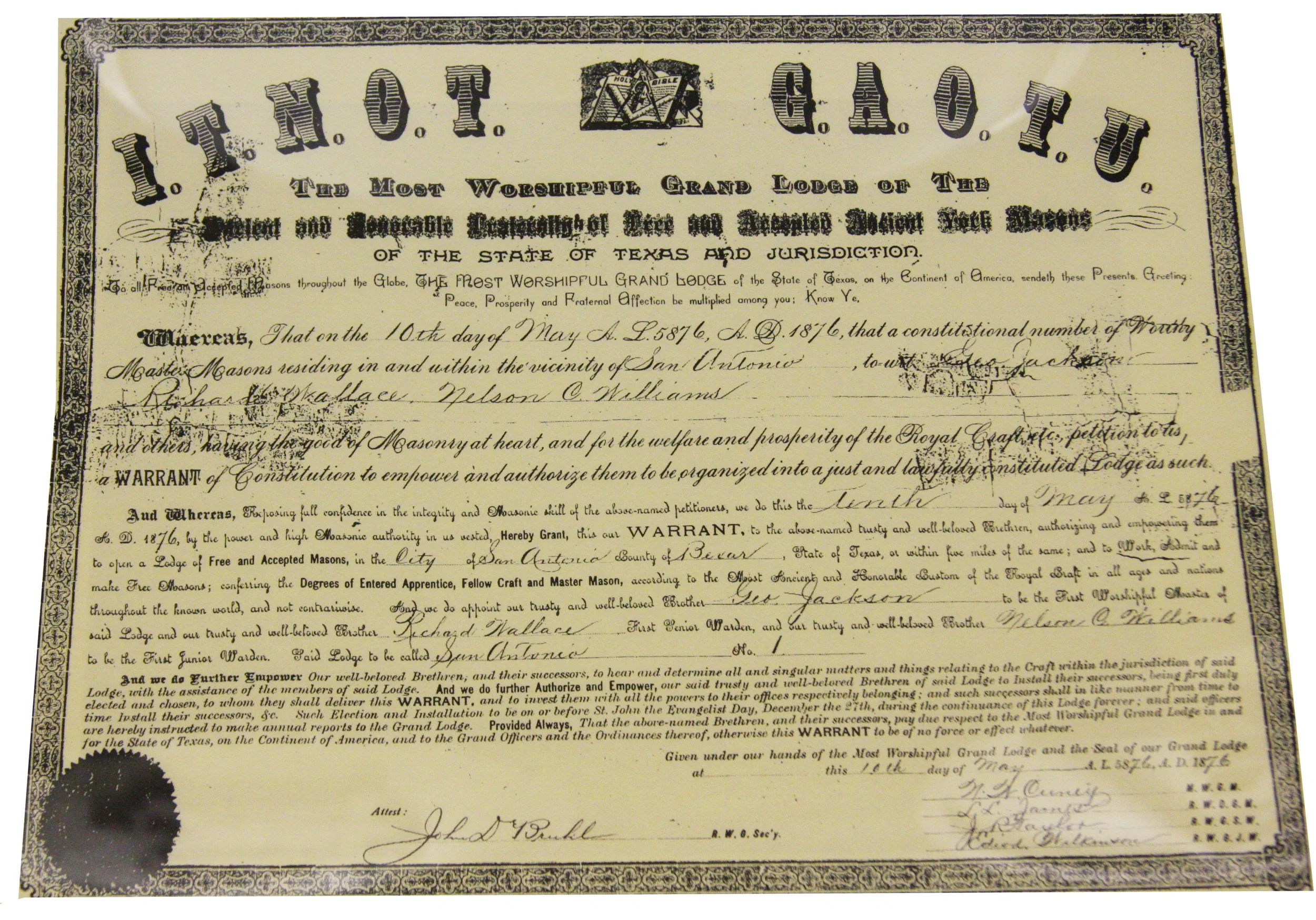 On Aug. 19, 1875, representative of three of the six Prince Hall Lodges in Texas met in Brenham and formed The Most Worshipful Grand Lodge, Free and Accepted Ancient York Masons of the State of Texas on Aug. 20, 1875, in which San Antonio Lodge No. 22 was re-chartered as San Antonio Lodge No. 1 on May 10, 1876. The Lodge’s first principal officers were Brothers George Jackson (Master of the Lodge), Richard Wallace (Senior Warden), and Nelson Williams (Junior Warden). In 1950, a resolution was approved to rename the Grand Lodge to The Most Worshipful Prince Hall Grand Lodge, Free and Accepted Masons of Texas and Jurisdiction.